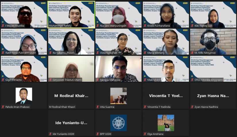 Wednesday, March 2, 2022, BPP UGM held a virtual workshop on holding an international conference with proceedings indexed by Scopus 2022. This event was attended by 25 participants of which were representatives from the work unit which will hold an international conference in 2022. This event was opened by the Head of BPP UGM, Prof. Widodo, S.P., M.Sc., Ph.D. In his speech, he conveyed that the milestone of UGM publication in Scopus has reached three million documents per year. One of them is a contribution from the output of an international conference published in the Scopus index proceedings. This shows that the trend of holding international conferences is increasingly oriented towards the output of the publications, not only event ceremonials. Hence, the preparation for holding an international conference before and after the event is crucial. BPP UGM fully supports international conferences initiated by the work unit at UGM. BPP UGM has prepared various assistance and incentives related to international conferences. In addition, BPP UGM is also ready to assist the organizers to prepare for an international conference.
