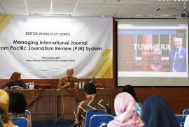 Editor workshop dibuka secara resmi oleh Kepala BPP UGM, Widodo, S.P., M.Sc., P.hD. Usai dibuka workshop langsung dilanjutkan dengan pemarapan oleh Prof. David Robie dari Pasific Journal Review (PJR System) membawakan topic “Managing a global research journal”. PJR merupakan jurnal peer-review yang meliput bidang ekonomi politik, media, isu media, dan komunikasi di Pasifik Selatan, Asia-Pasifik, Australia dan Selandia Baru. Prof. Robie memaparkan tentang tujuan penelitian, teori dan praktik jurnalisme di PJR, jurnal ini juga memperluas minatnya ke bidang penelitian dan penyelidikan baru yang mencerminkan dampak yang lebih luas dari praktik dan pendidikan media kontemporer.