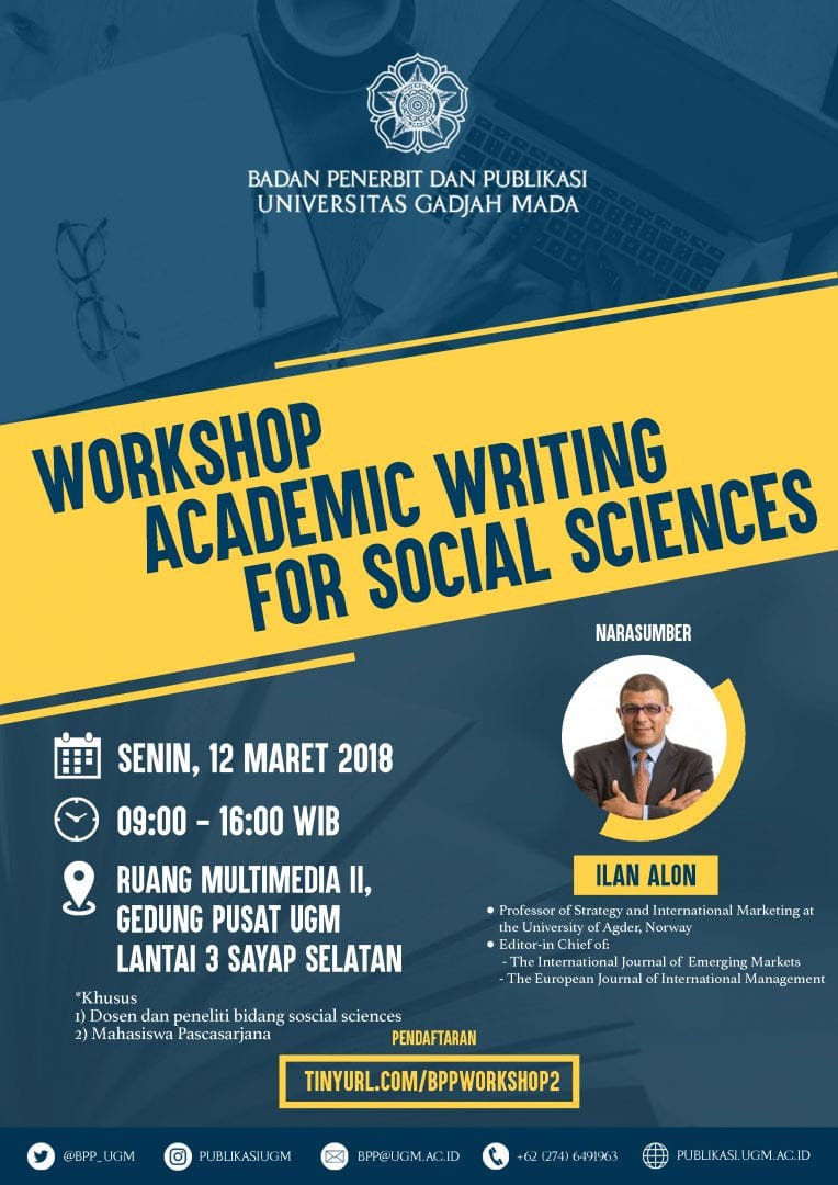 Workshop Academic Writing for Social Sciences Oleh: Waktu : Senin, 12 Maret 2018 Waktu Senin, 12 Maret 2018 Lokasi Ruang Multimedia 2, Kantor Pusat UGM, Lantai 3 Sayap Selatan, Bulaksumur, Yogyakarta 55281 Informasi selengkapnya