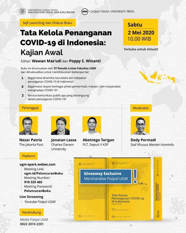 Buku “Tata Kelola Penanganan COVID-19 di Indonesia: Kajian Awal” yang diterbitkan oleh FISIPOL UGM bekerjasama dengan Gadjah Mada Press atau UGM Press ini dimaksudkan untuk mendiskusikan: 1) Bagaimana dinamika tata kelola dan kebijakan penanganan COVID-19 di Indonesia?; Bagaimana respon berbagai pihak (pemerintahan, industri, dan masyarakat) menghadapi COVID-19?; dan Bentuk komunikasi publik dan debat pengetahuan apa yang berlangsung dalam penanganan COVID-19?